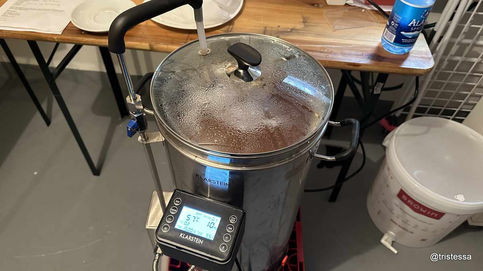 Nachdem die Würze nach dem Rezept erstellt wurde, wurde sie teils auf der Terrasse (Außentemperatur 11°C) und teils im Keller 22°C heruntergekühlt. Das bedeutet, am nächsten Morgen 6:00 Uhr war die Temperatur erreicht, so dass wir die Hefe hinzugeben konnten.
