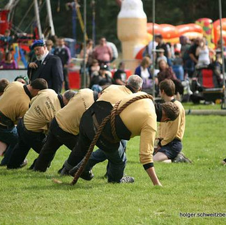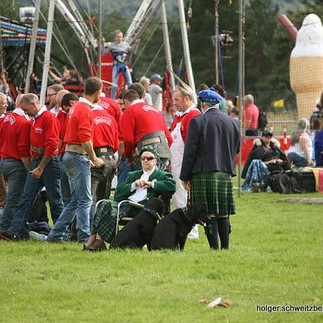 Wir ergattern noch zwei Stühle und können nun sitzend das Spektakel verfolgen. Zum Beispiel, dass Baumstammwerfen. Ein sechs Meter langer Baumstamm muss so geworfen werden, dass er sich um 180° dreht und in Wurfrichtung möglichst gerade liegen bleibt. Aber auch Hammerwurf, Kugelstoßen und ich nenne es mal Eisenhochwurf (dabei muss ein schweres Eisenteil über eine Stange geworfen werden, Höhe so drei-vier Meter) werden gezeigt.