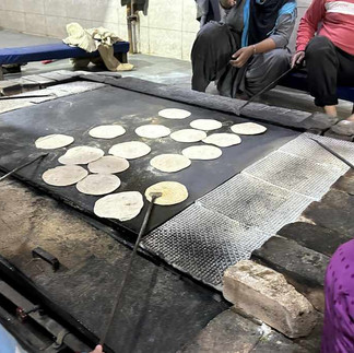 Wir besichtigen die Küche und den Essensraum. Er ist mit Teppichläufern ausgelegt, auf den die Gläubigen später sitzen und essen. Als wir ankommen, sitzen bereits viele Menschen vor dem Eingang und warten auf Einlass.