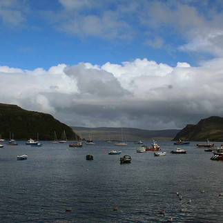 Von dort hat man eine schöne Rundumsicht und keinen Atem, wenn man oben angekommen ist. Wehmütig verlassen wir wieder das Gelände, vorbei an den freilaufenden, grasenden Kühen, die hier überall stehen. Zurück am Parkplatz, der nun schon leerer ist, treffen wir die Entscheidung, nach Portree, der Hauptstadt der Isle of Skye, zu fahren.