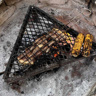 Ich bereite den Grill vor und Heidi den Salat. Heute gibt es ein rein vegetarisches Menu: Maiskolben. Tomaten-Gurke-Feta-Salat und Lammkotelett.