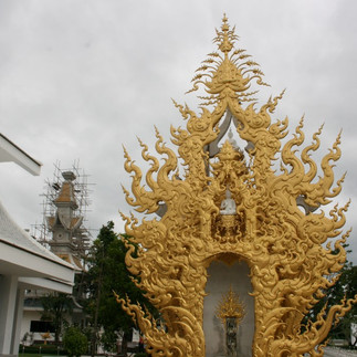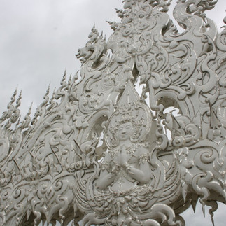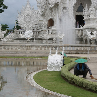 Nach ca. zwei Stunden erreichen wir die Stadt Chiang Rai. Hier besichtigen wir einen weißen Tempel. Weiß bedeutet in Thailand Reinheit und Jungfräulichkeit. So ist dieser Tempel etwas ganz Besonderes. Er sieht ohne die vielen bunten Farben auch ganz anders aus – von der Architektur her, ist dies aber nicht der Fall. Wir begeben uns dabei von der Hölle in den Himmel – das bedeutet Glück, wie alles in Thailand das mit Buddha zu tun hat.