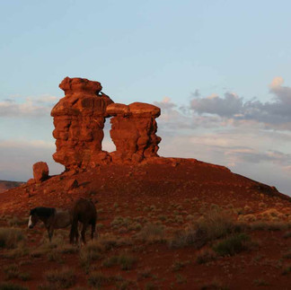 Wir stehen vor dem Halfmoon und Honeymoon-Arch, sehen den Butt-Rock (Arschstein - er sieht wirklich so aus), einige Hoodoos, einen Felsen, der einer Schildkröte gleicht und, und, und. Vor dem »Salt'n'Pepper« grasen zusätzlich zwei Pferde und ein Fohlen. In Verbindung mit dem Felsen und dem Sonnenuntergang, ein herrliches Bild. Das könnte gut als Vorlage für irgendeine Reklame dienen die mit »Western« zu tun hat.