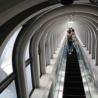 Wir fahren mit dem Aufzug in den Floating Garden dieses außergewöhnlichen, stylischen Komplexes. Der Aufzug fährt außen die 107 Meter an der Fassade empor, dann geht es noch einmal ein paar Rolltreppen hinauf (zum Glück keine Stufen) und man ist oben.