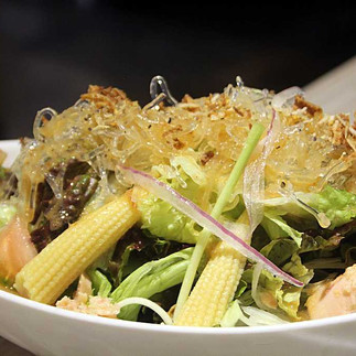 Es beginnt mit dem Salat, der als Topic eiskalte, halbgefrorene Glasnudeln mit Röstzwiebeln enthält. Das Omelett und die Yakis werden noch mit einer Art BBQ-Sauce und Mayonnaise versehen und dann kann man die Stücke, die auf der Heizplatte liegen, zerschneiden und essen. Der Geschmack des gesamten Menüs - sensationell.