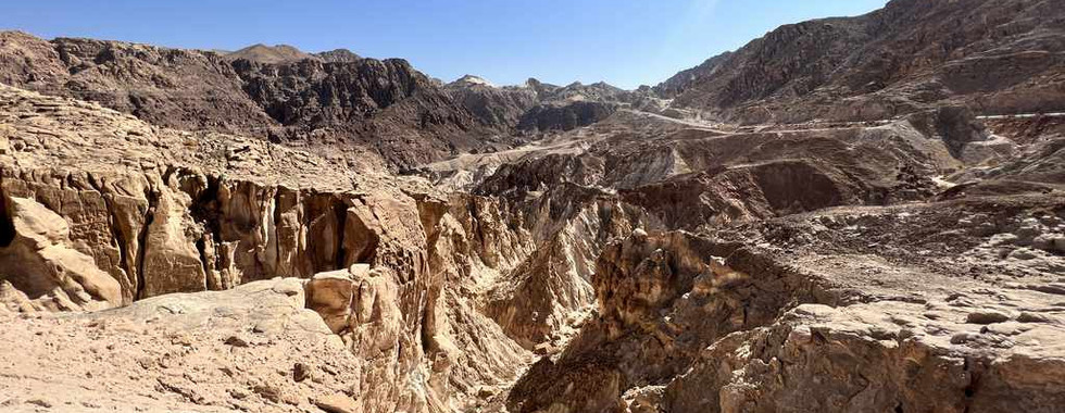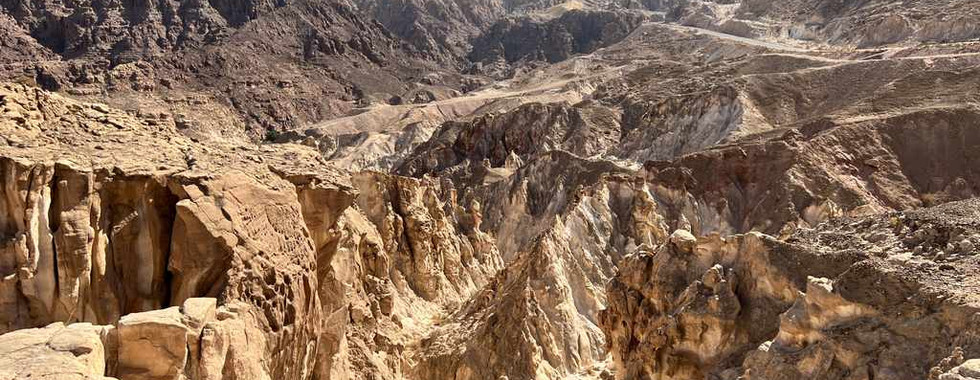 An einem Ausblick können wir sogar einen Teil mit rötlicher Färbung sehen. Der Farbkontrast ist einmalig. Auf diesem Parkplatz sitzen auch drei Jordanier, die Tee trinken und essen. Sofort sind wir eingeladen uns dazu zu setzen, was wir aber ablehnen.