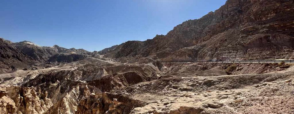 Die Gegend wird jetzt viel schöner, viel bergiger. Endlose Serpentinen gilt es zu bezwingen. Leider gibt es wenige Stellen um die Aussicht zu genießen. Gelingt es aber doch haben wir wunderschöne Ausblicke auf die fast weißen Berge und die sich darum schlängelnde Straße.