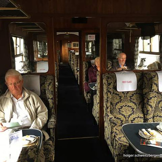 Ein Zweiertisch im Erste-Klasse-Abteil. Hier ist alles sehr plüschig, man fühlt sich in die Anfänge der Zugfahrt zurückversetzt und wenn man bedenkt, dass mit diesem Zug auch Harry Potter gefahren ist...