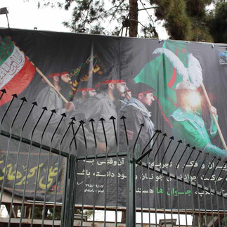 Wir schießen noch ein paar Fotos und entdecken ein großes Haus auf der anderen Straßenseite. An ihm ist die gesamte Außenfassade mit Slogans gegen den Aggressor USA und Märtyrerbildern beklebt.